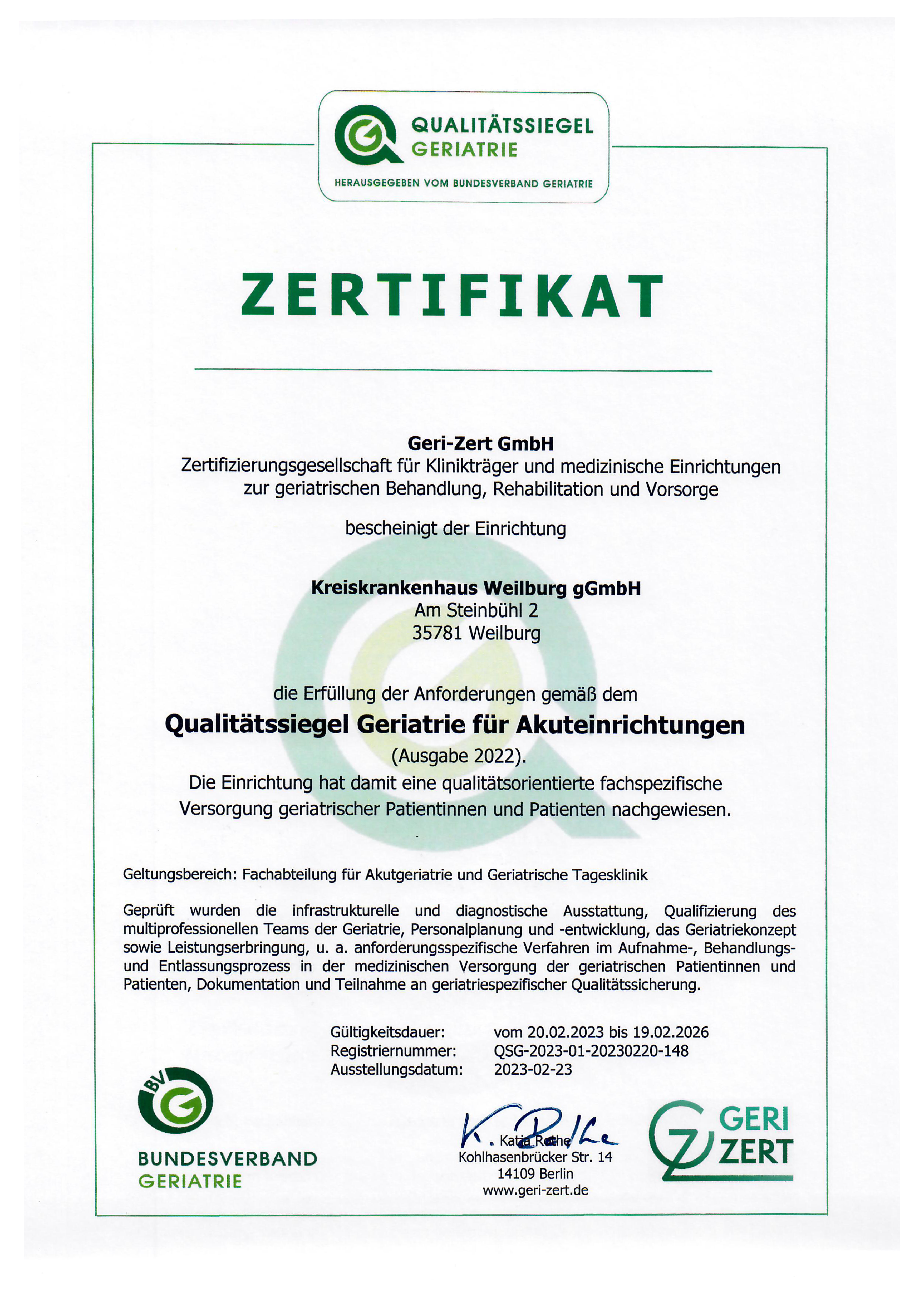 Im Ergebnis dieser umfassenden Audits wurde der Abteilung das Qualitätssiegel-Geriatrie vom Bundesverband Geriatrie verliehen. Das Zertifikat wurde mit einem ausgezeichneten Ergebnis durch die Zertifizierungsgesellschaft DQS erteilt und bestätigt damit die herausragende Versorgungsqualität des Kreiskrankenhauses im Landkreis Limburg-Weilburg. Von insgesamt 32 geriatrischen Einrichtungen in Hessen haben nur 11 das Qualitätssiegel erhalten – und wir gehören dazu.